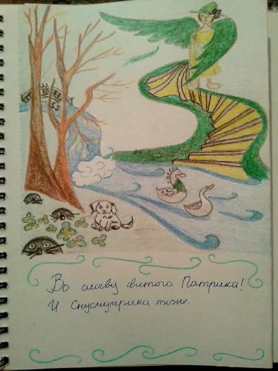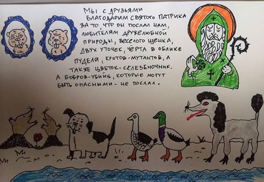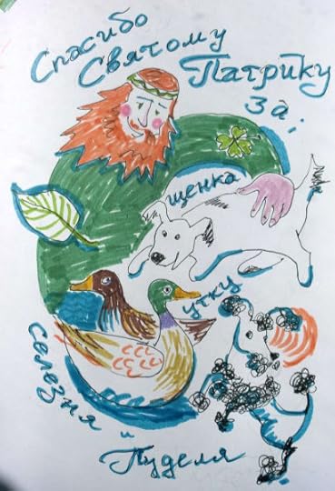 Святой Патрик оказался добрейшим чуваком. Он сразу понял, как невыносимо мы страдаем от нехватки бобров и заметался в поисках выхода. Тревожить засевших по домам бобров постеснялся, поэтому вместо них послал нам много хороших боброзаменителей. Например, тугого бело-чёрного щенка, самой природой созданного для дружественного тисканья, и утиную пару, где уточка была маленькая, серая и деловитая, зато селезень кудряв, как будто провёл ночь и ещё пол-дня в бигуди. Напоследок добрый Святой Патрик послал нам подростка чёрного пуделя, отчаянно косящего под Мефистофеля, в алом ошейнике, ррррвав! Но сделка не удалась, к этому моменту мы уже были настолько утешены, что не стали бы менять бессмертные души на какого-то дурацкого бобра. Подумаешь - бобр!