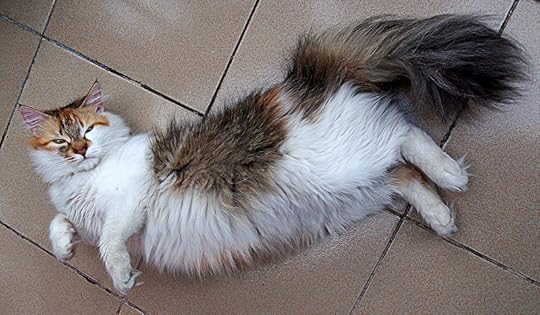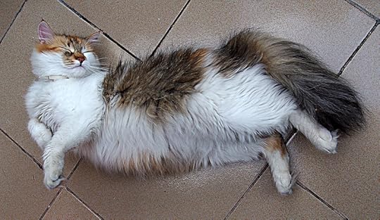 - теперь, когда бурный рост закончился, котёнок Котовская очень мало и неохотно ест (раза в три меньше, чем старшая кошка), предпочитая сухой корм чему угодно, даже свежей птице и рыбе. Но все равно она толстяк с толстым пузом. Такая уж у нее удивительная конституция.