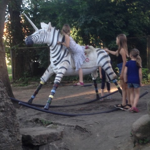 Дружеский ребёнок обиделся на зебру-единорога во дворе Ужупского Инкубатора - вот эту: