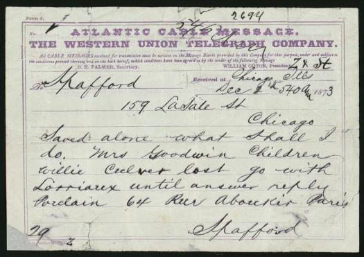 “Saved alone what shall I do. Mrs Goodwin Children Willie Culver lost go with Lorriaux until answer reply . . . Paris. Spafford.”-
