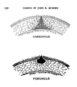 A furuncle is a superficial infection, but when it extends to form a carbuncle, it develops deep roots. These deep roots may be compared to the deep tap roots of the eucalyptus tree, which shoot downward until they strike rock and then spread like the banyan in every direction. Much the same course of events occurs in the development of a carbuncle, and that is what distinguishes it from a furuncle. The line of infection in a carbuncle extends down ward in a relatively straight direction until it meets the deep fascia; then it spreads out along the surface of the fascia beneath the fat. That is why a superficial incision in the skin does no good. One does not reach the center of the infection. One must incise a carbuncle clear down to the fascia. One can easily trace the course of the necrosis down to the fascia, where it spreads out.