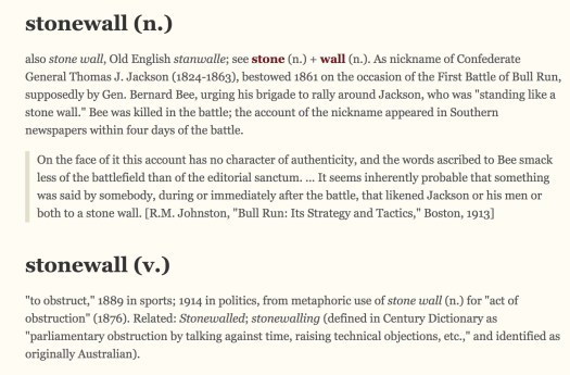 The bigger problem: there’s no detailed information on the etymology. In fact the Etymology Dictionary disagrees with Merriam-Webster on the verb stonewall: