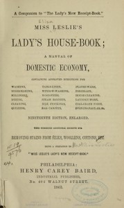 Miss Leslie’s lady’s house-book; a manual of domestic economy containing approved directions for [everything] (also available at hathitrust, another great place for reference works). Eliza Leslie. 1869.