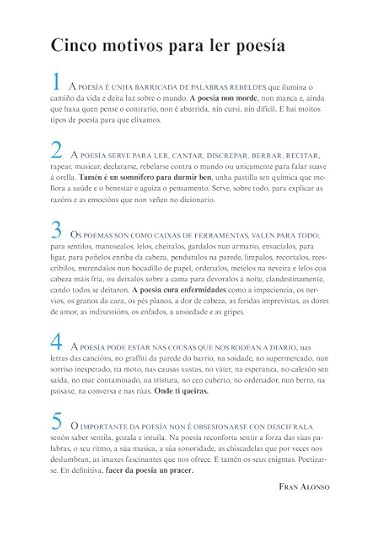 No ano 2007 os responsables da Consellería de Cultura e Deporte da Xunta de Galicia solicitáronme un texto que animase a ler poesía para celebrar o 21 de marzo, Día Mundial da Poesía. O texto, que lin no Mercado de San Andrés na Coruña durante a presentación oficial da campaña, publicouse nos principais medios de comunicación do país e tivo unha excelente acollida nos centros de ensino e nas bibliotecas públicas e escolares. Tituleino 5 motivos para ler poesía. Desde aquela, os meus 5 motivos para ler poesía circulan por internet, en pdf ou copiados nos blogs, espallados polas distintas redes sociais e empregados como recurso didáctico. Non podo máis que agradecer ao profesorado, ás persoas responsables das bibliotecas e aos lectores e lectoras o entusiasmo con que acolleron e compartiron os 5 motivos para ler poesía.