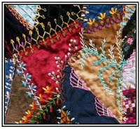 I digress. But as I dove into the art of crazy-quilting, I decided I was going to make a king-sized spread (I know, I know. What was I thinking?) I went to the fabric store and spent over $100 buying luscious fabrics in deep jewel tones. I bought a couple books on the craft, ones that offered me different embroidery stitches. For you see, along the seam of each oddly shaped piece of fabric, you’re supposed to embellish it with embroidery and beads and bits of lace. I bought $30 worth of floss and thread and a packet of needles. You can never have too many needles. And why not one of those nifty cutting boards with a rotary cutter? After 50 years of sewing, it was time to move up from mere scissors. $60? Why not.