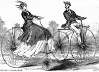As bicycles gained popularity in the 1880's, women's clothing was adapted for ease of movement. No more bustles! As early as 1850 Amelia Bloomer developed "bloomers" to wear under a skirt, thus giving women more freedom of movement. With bicycles, the bloomers were ends in themselves. How risque! Some considered women who rode bicycles whores... Yet in the decade of 1890-1900 over a million women would ride bicycles. Beyond all the other sports, bicycling was a wide-spread hit.