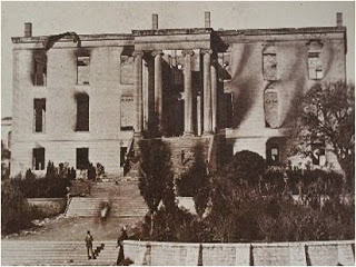 In 1881, the Texas Capitol building (pictured above as it appeared in 1875) was destroyed by fire (after the fire below right). The Texas Legislature decided that when they rebuilt, they would use only materials native to the state. They initially chose limestone, as there was a quarry near Austin, but when iron particles in the rock led to discoloration, they elected red granite instead.
