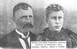 And he did. He married the baby, Emma, when she was 16, and he was 38. The community used to have barn dances. Emma loved to dance and Noach was attracted to the vivacious girl. But what did she see in him? There's no record of the whys behind it. Logically he married because he was attracted to her, maybe even loved her, and needed a wife to help him with his homestead. But Emma? A vivacious 16-year-old? Did she want to get away from home that badly? Did she love him? Did her parents approve and encourage her? Or were they against it? Whatever the motivation and emotions, the two were married in 1888, had six children, and were together until their deaths in the 1930's.