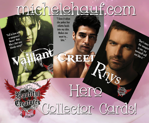 I'm so excited! I made up some Hero Collector Cards, and they just arrived. They look awesome! If these go over well, I'll continue to make them up for future and past heroes. I have only these three to begin with. If you want all three, just send a SASE to Michele Hauf, PO Box 23, Anoka, MN 55303. (they will fit in #10 business envelope or that smaller size that you use to send checks in.)