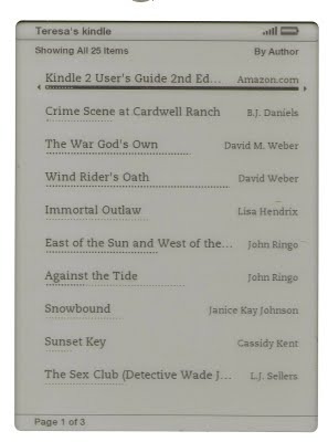 Teresa says: So the idea of sharing one's TBR list/pile is pretty exciting. But sharing it on the kindle, that's even more fun. The thing is, Michele talked about screen shots, but all that shows are the books you purchase from Amazon, and doesn't show what's left to read and what isn't. In fact, it doesn't even give you the opportunity to sort them except in alphabetical order. So I thought I'd try to show you just a few of what I have loaded on the kindle proper.