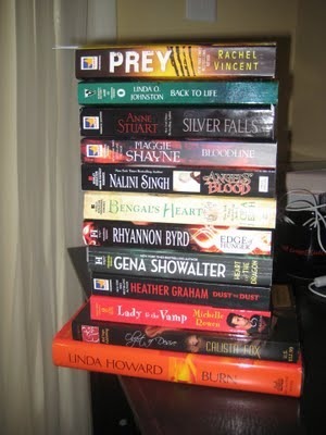 Thanks to my recent trip to RWA Nationals in D.C., my TBR pile has some great new additions. Paranormals are my favorites, so, yes, those always top the list of must-reads. I've been wanting to read Linda Howard's BURN for a while, but it's a reward read (a read I only get when I finish a project; yes, I have to pace myself or I'll go book crazy!). Can't wait to read Lora Leigh's newest--she never disappoints. Ah, so many bo