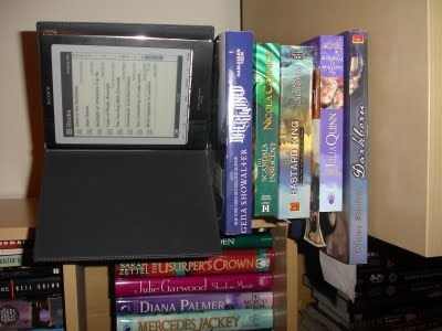 Many people's To Be Read piles are massive (I don't know whether to be horrified or jealous of SciFi Guy's shelf!)—but as you can see from my photo, my TBR pile isn't that big…at least, until you consider what's sitting on top of that stack. Yep, that's my Sony Reader which is holding an additional six eBooks that are TBR.