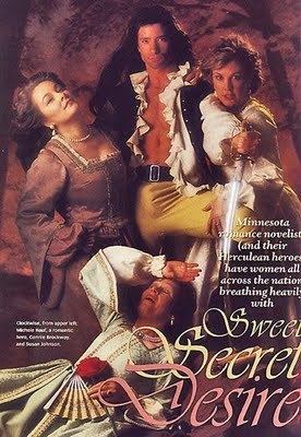 Found this pic on Connie Brockway's website. (She's on the right; Susan Johnson is swooning on the floor; that's me on the left looking...kinda bored.) We did an article for Minnesota Monthly so many years ago, and they wanted this spoofy photo. The things we do for our craft. At the time we were all writing historical. I do recall the model being very nice, a little worried his wig was crooked, as well as the sock in his pants. ;-)