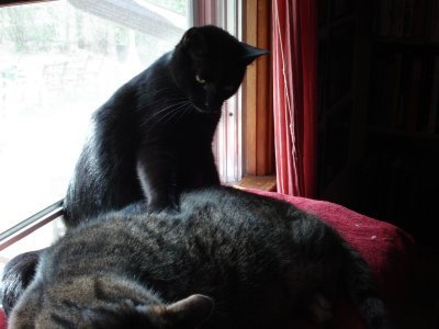 A touch like that only happens once. The picture taken two seconds later is a blur of fur as Toast (cat lying down) lashes out at Max. He does not like the new cat one bit. His most common mood is grumpy, and he has perfected the grump growl.
