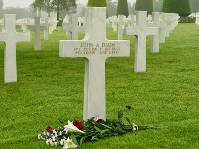 The grave of John Daum, 82nd Airborne, in Normandy. Photo by Bill Nation, whose uncle, a captain in the 508th Parachute Infantry Regiment, was killed in the Battle of the Bulge.Every Memorial Day I give some special thought to the interviews I've done in which veterans talk about members of their unit they were close to who never got the chance to come home from the war, or who came home in a casket years later. Here are some audio clips of veterans, and in one case a sibling, talking about those who went off to World War II and made the ultimate sacrifice.