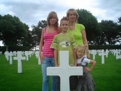 The family of Wil Goertzen at Ed Forrest's grave. Goertzen teaches history at Carbooncollege, a school in the Netherlands which "adopted" Ed's grave in the American cemetery at Margraten.Clifford Merrill on Ed Forrest