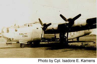 King Kong, pilot Jim Baynham, shot down on the Kassel MissionNot that they were defenseless. Each B-24 Liberator was heavily armed with several .50-caliber machine guns that were blazing away during the battle. According to most accounts, the battle lasted less than six minutes, by which time the criews of "Mayday!" over the radio drew the cavalry in the form of the P-51s of the 361st Fighter Group. By the time it was over, 25 planes of the 445th Bomb Group were shot down. Many of the German fighter planes were shot down as well, and one American fighter pilot was killed.