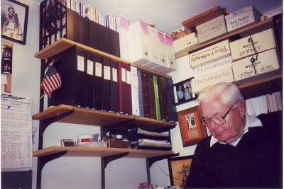 Kassel Mission Memorial Assn. co-founder George Collar in his "war room." Of the ten remaining Liberators, three crash-landed in Allied-occupied Europe, two reached an emergency landing base in England, one overflew the group's base at Tibenham, and only four made it back to base. I began interviewing survivors of the battle in 1999 after I visited a monument in Germany that has the names of every American and every German killed in the battle. The nonument, built by the Kassel Mission Memorial Association -- later called the Kassel Mission Historical Society -- with the help and inspiration of German historian Walter Hassenpflug, is a powerful testament to closure between former enemies.