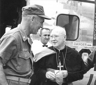At Christmas 1965, into this scene, came an old man who had traveled the fronts of three wars, Francis Cardinal Spellman. To some he may be a controversial figure in church history, but no one could deny his great affection for young Americans which motivated him to travel thousands of miles in all kinds of aircraft to assure the troops that they were appreciated and unforgotten. His heart went out to all those young men, too young to vote on the policies determining their sad fate. His message assuring them of the dignity of their lives was amplified by his frail condition. To think he had come so far even though his legs were too weak to climb unaided the platform to the altar.