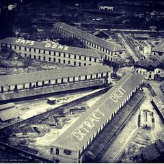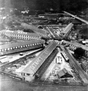 "British Here" is barely visible in the lower center cellblock. The words "Japs Gone" would be two cellblocks to the left, just out of the picture. A Royal Air Force Mosquito nevertheless bombed the outer perimiter of the complex, according to a written account by Donald Lomas, one of the British prisoners. The British then climbed to the roof of another cellblock and painted "Extract Digit," a story told by Karnig and confirmed in Lomas' written account.