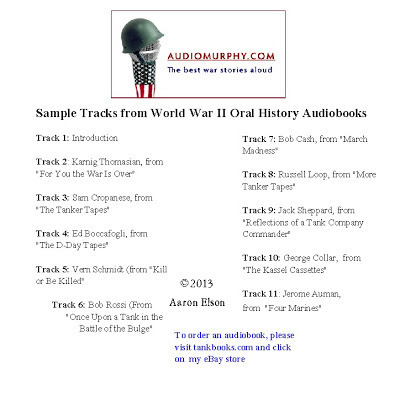 Today I'm going to don my chapeau as an oral historian, and post a the audio from a sampler CD containing tracks from several of my oral history audiobooks. The audiobooks are available in my eBay store. You can also order audiobooks by calling the oral history hotline at (888) 711-TANK (8265). Click on the links below to listen to the sampler in mp3 form. Track 1 Introduction (Aaron Elson) Track 2 Karnig Thomasian, POW of the Japanese, from "For You the War Is Over" Track 3 Sam Cropanese, 712th Tank Battalion, from "The Tanker Tapes" Track 4 Ed Boccafogli, 82nd Airborne Division, from "The D-Day Tapes" Track 5 Vern Schmidt, 90th Infantry Division, from "Kill or Be Killed" Track 6 Bob Rossi, 712th Tank Battalion, from "Once Upon a Tank in the Bulge" Track 7 Bob Cash, 492nd Bomb Group, ex-POW, from "March Madness" Track 8 Russell Loop, 712th Tank Battalion, from "More Tanker Tapes" Track 9 Jack Sheppard, from "Reflections of a Tank Company Commander" Track 10 George Collar, 445th Bomb Group, from "The Kassel Cassettes" Track 11 Jerome Auman, from "Four Marines" (c) copyright 2013 Aaron Elson