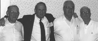 The Morse Johnson Memorial Johnson entered the horse cavalry and became a sergeant, later receiving a battlefield commission with the 712th. His platoon withstood nine counterattacks at Oberwampach during the Battle of the Bulge. When I interviewed Morse in 1992 during a trip to Cincinnati, he apparently was in the early stages of Alzheimer's disease, which would claim his life a few years later. Standing to Morse's right is Sam MacFarland, who introduced me to the 712th Tank Battalion Association, and helped me find three veterans who remembered my dad (who was wounded twice but survived the war, and passed away in 1980). I would love to have interviewed Sam, but he died of cancer before I attended another reunion. Shortly before passing away, Sam wrote in a letter to Ray Griffin, then the battalion association president, that "Time is succeeding where Adolf Hitler failed." I heard many stories about Sam, including one where he learned while in combat that his wife, Harriet, had given birth to a daughter. He was a sergeant at the time, and conferred with the members of his crew as to what she should be named. They came up with Lucky. Sam was one of 14 members of the battalion to receive battlefield commissions. If a picture is worth a thousand words, I'd better post this before the rest of the day flies by, and I'll get to the four men sitting in the front row, from left, Bob Hagerty, Ellsworth Howard, Howard Olsen and Jule Braatz, in my next post.