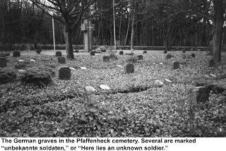 was killed at Pfaffenheck. When they held the ceremony in 1995, the Germans were expecting protests because anything to do with the Waffen SS was frowned upon in Germany. There was a significant police presence, but perhaps because it rained that day no protesters showed up. I returned from that reunion with about six hours of interviews in German with only the brief synopses by my two interpreters. I learned that the 1995 ceremony was unique only in that it marked the 50th anniversary of the battle, but that the veterans of the 6th SS Mountain Division North gathered in Pfaffenheck every year on the anniversary of the battle because 100 members of their division are buried in the village cemetery, and more are buried in the nearby town of Buchholz where there was another pitched battle, but one that to the best of my knowledge did not involve my father's tank battalion. When I went with the German veterans to the ceremony in Buchholz, they showed me an antiaircraft gun preserved in the village, that had been used against the ground forces. One of the men killed in Pfaffenheck, Sergeant Russell Harris, was struck in the head by a shell from a 40-millimeter antiaircraft gun. One thing I will say is that while I found the German veterans to be very human -- I remember overhearing something about Gehringer's wife suffering from depression, and Gehringer himself, who was the burgomeister of a medieval town called Rothenburg on the Tauber, would die the following year -- I can't say as much for some of the younger people who attended the ceremony/reunion. There was a young museum director I think from Koblenz who brought with him a rusty old pistol that had been found in the forest, and he was trying to confirm that it had belonged to Gunther Degen, and I very much sensed that he was more upset than most of the veterans that the Germans lost the war. And there were a couple of young what seemed to be neo-Nazis from Switzerland. I also sensed that my hosts were at least a little bit uncomfortable with what to some is the cult status of the Waffen SS. Those tapes -- and another three hours worth from 1996, when I returned to Pfaffenheck for their reunion, but more about that anon -- languished on a shelf until last year, when I heard from two men in Germany who belong to some sort of archeology club and were researching the events at Pfaffenheck. I was able to put them in touch with one of my hosts -- the other has since passed away -- and I sent them copies on CD of the interviews, which they promised to translate, although I haven't yet received the translations.