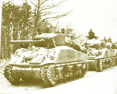 A platoon of A Company tanks in Bavigne, Luxembourg during the Battle of theBulge. The driver of the lead tank is Dess Tibbitts; the tank commander, on the left