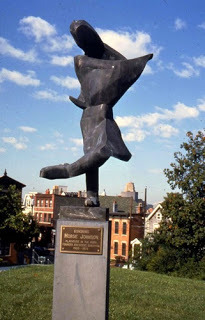 The two men standing are Morse Johnson, on the left, and Sam MacFarland. I wrote an earlier blog entry about Johnson, although I failed to mention that there are only two statues that I know of dedicated to veterans of the 712th. One is of Tullio Micaloni, a sergeant who was killed at Seves Island in Normandy and who is one of four soldiers on the 90th Infantry Division monument in Perier, France. The other is Morse Johnson, and it stands near the Playhouse in the Park in Cincinnati's Mount Adams district. Unlike most statues dedicated to heroes, Johnson isn't riding a horse or sticking his head out of a tank, in fact you likely wouldn't know it was him unless you read the plaque, as the statue is an abstract figure of a human form. After the war, Johnson was a patron of the arts, and was a founder of the Playhouse in the Park, which even today has a Morse Johnson Society for donors.
