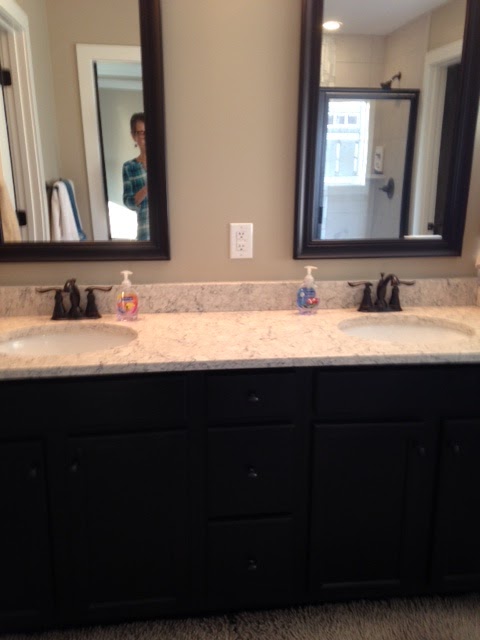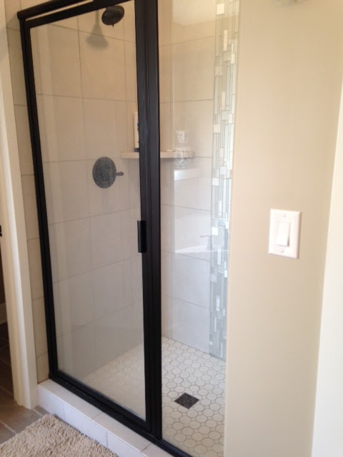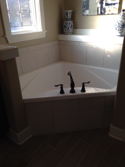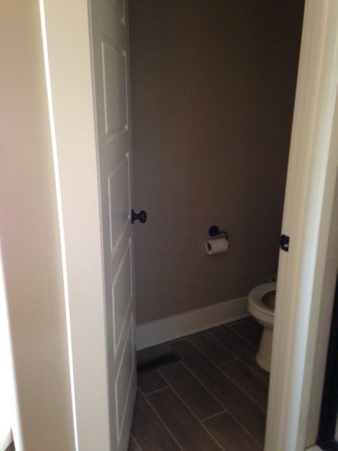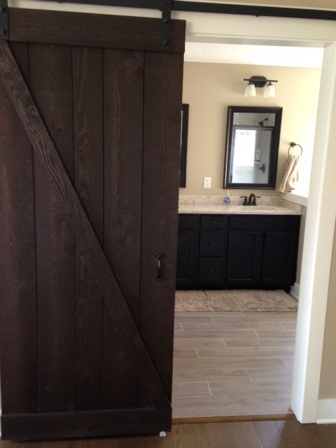 They have a new home that is quite nice. I fell in love with the master bath and wanted to share it with you. I was quite intrigued by the door. It's on gliders and as you can see, replicates a barn door.