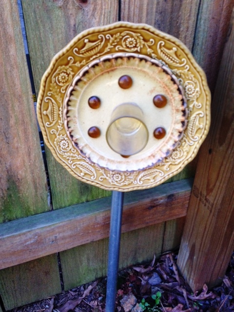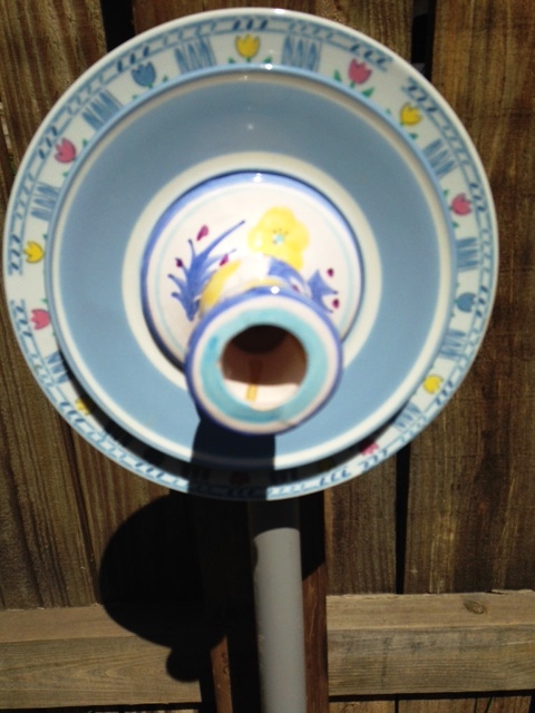 Like them?A friend of mine makes them. It's her version of decluttering or 'cleaning out the cabinets'. She takes dishes, bowls, ceramics, candle holders, etc. that she no longer uses and converts them to yard ornaments. Pretty cool, huh?
