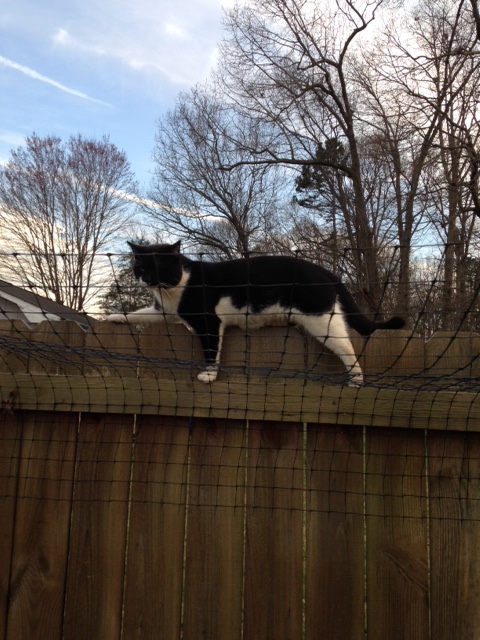 As most of you know, our fence is set up to keep the cats inside. Let me just say this is not our cat. Apparently, besides keeping our cats in, it keeps other cats out. I'm still not sure how he got up there. After whining pitifully for a few minutes about his predicament he did jump down. With that paw on the rail it looks like he's posing doesn't it?