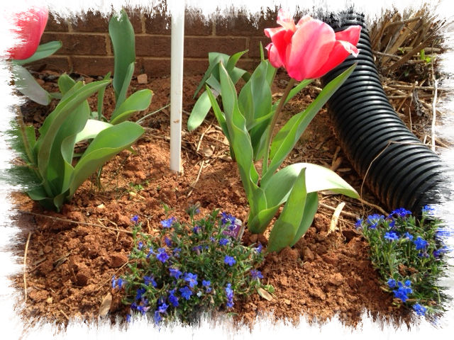 I decided to add some blue to my tulip bed. The newbies are phlox and love full sun. They should do fine this spring but when summer arrives so will shade from the butterfly bush. Toes-crossed they'll survive and thrive. Though I'll settle for just survive:)