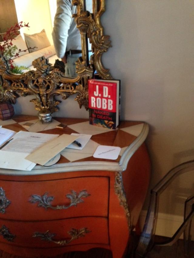The Inn had plenty of spots for relaxing including balconies, a courtyard and a television niche with a loaded refrigerator nearby. My favorite place to hang out was, of course, the library. Beside plenty of books to read--yes, lots of Norah and J.D. Robb--there was a fireplace; Keurig with pods that included coffee, cider, hot chocolate or tea; and a decanter of whiskey. This is the room we had our wine and cheese in. Very cozy and relaxing.