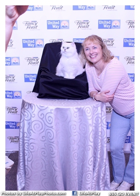 Below is a pic of my sis modeling with one of the Fancy Feast Cats. Since the company she works for makes pet food, she gets to meet a lot of the celebs in the animal world. Isn't this ball of fluff gorgeous? I had to really study the picture. It looked so perfect, I thought it was a stuffed animal. The Fancy Feast Cats used in commercials that are made in the US, South Africa, Europe or Japan are silver chinchilla Persians. To adopt check your local shelter, rescue, petfinder.com or overstock.com.
