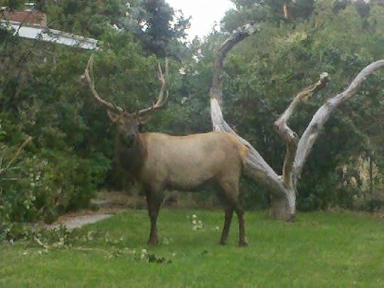 Remember my 'deer in the yard' pictures? This is what roams my sister-in-law's neighborhood in Colorado. And there was mention of a bear getting in the trash cans. Got any interesting visitors you'd like to share with the blogster buds?~*~Fake Out: I was standing on the screened-in porch when a hummer dived bombed straight at me, grumbling for all it was worth. It made a sharp right turn at the last moment, saving it from a collision with the screen. What the? I glanced down and figured out what had attracted him. He'd seen my bright orange/red toenail polish:) The moral of the story....don't go outside barefoot if you've got bright red painted toes.