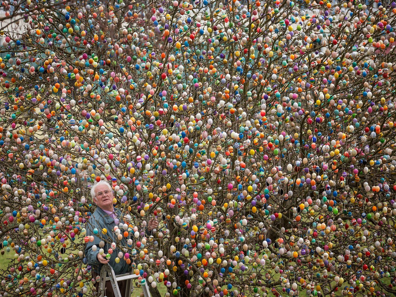 Mr. Volker Kraft, from Saaalfeld Germany hung 10,000 colored eggs in his apple tree this week.My idea of decorating for Easter is to toss a bunny face on my scrawny, stuffed alley cat I keep at work:)
