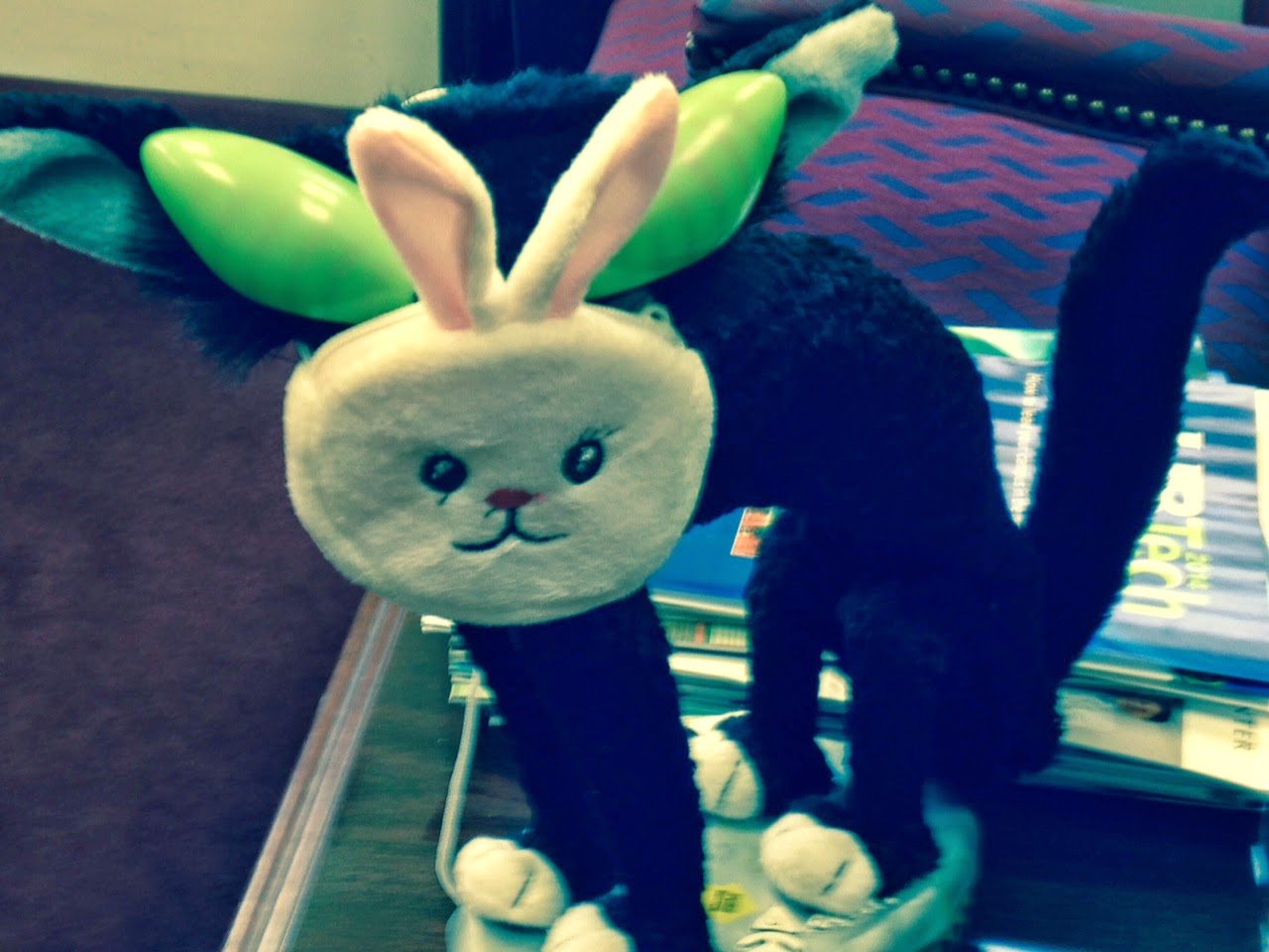He's motion activated. When he was younger he used to screech out: 'I'm nothing but an alley cat.' Over the years he has developed laryngitis so now he only arches his back and his eyes glow when someone walks by.