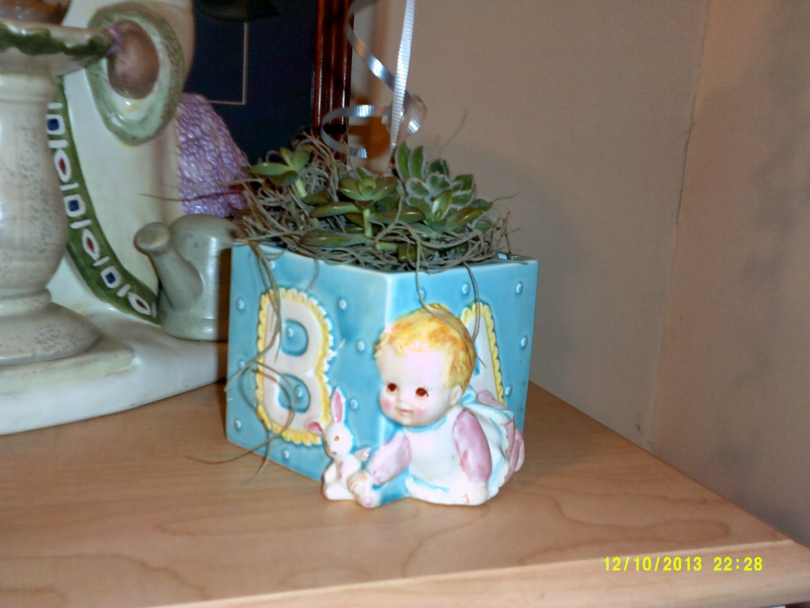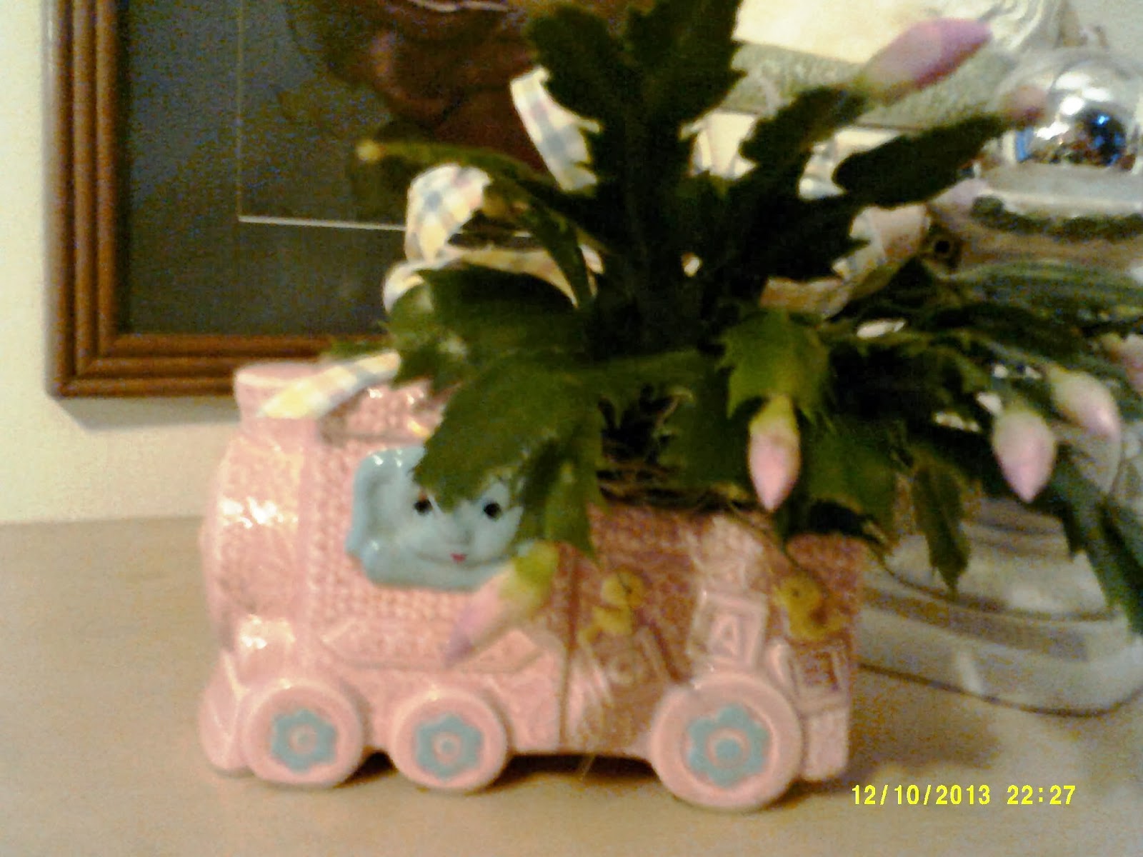 Babies are still in holding pattern, which is just fine with the hh since he is in the middle of giving and grading finals. I kept the ceramic planters from when my babies were born and I'm recycling them for the next generation. I took the planters to the local florist and had them put plants in them and when our little peas in the pod decide to make their entrance I'll take them to the hospital and give to the DIL. It's hard to tell from the picture but the one plant is a pink Christmas Cactus.