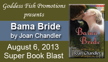 BOOKSTRAND PUBLISHING: http://www.bookstrand.com/bama-brideBLOG: www.joanchandler.wordpress.comtwitter account: @joanchandler1 Find me on facebook: Joan Chandleremail: joanchandler13@gmail.comJoan will be awarding a $25 Amazon gift card to a randomly drawn commenter during the tour.The tour dates can be found here: http://goddessfishpromotions.blogspot.com/2013/06/virtual-super-book-blast-tour-bama.html