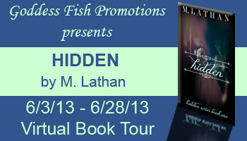 Encourage your readers to follow the tour and comment; the more they comment, the better their chances of winning. The tour dates can be found here: http://goddessfishpromotions.blogspot.com/2013/04/virtual-book-tour-hidden-by-m-lathan.html