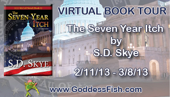 An award-winning author of romantic comedies in her other life, Skye is a member of the Maryland Writer's Association, Romance Writers of America, and International Thriller Writers. She's addicted to writing and chocolate--not necessarily in that order--and currently lives in the Washington D.C. area with her son. Skye is hard at work on the next installment of the series. www.facebook.com/authorsdskyewww.twitter.com/sdskye1www.authorsdskye.com Buy Links Ebookhttp://www.amazon.com/Seven-Year-McCall-Novel-ebook/dp/B00AM4HVT2/ref=la_B00AMAUFK8_1_1?ie=UTF8&qid=1355625857&sr=1-1Paperback http://www.amazon.com/Seven-Year-Itch-McCall-Novel/dp/0983920230/ref=sr_1_3?s=books&ie=UTF8&qid=1355625984&sr=1-3&keywords=s.d.+skye