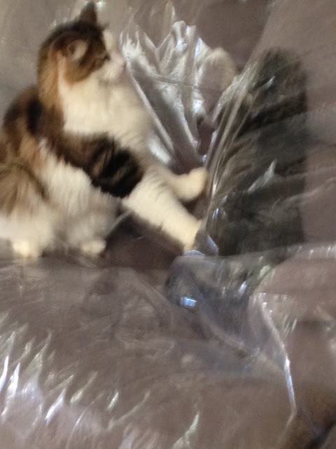As many of you know, we keep a plastic cover on the spare couch to keep it from turning into a scratching post. Callie got up inside and was having fun running back and forth. Frank decided it was a big rat--and maybe he was right--gave chase and cornered her. Not to worry, she could breathe just fine. It's not a thin plastic, was wide open at the bottom and we were keeping a close eye on her.