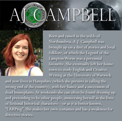 Born and raised in the wilds of Northumbria, A.J. Campbell was brought up on a diet of stories and local folklore, of which the Legend of the Lampton Worm was a perennial favourite. She eventually left her home town to study English and Creative Writing at the University of Warwick and now lives in Hampshire, (which she persists in calling the “wrong” end of the country), with her fiancé and a succession of dead houseplants. At weekends she can often be found dressing up and pretending to be other people, immersing herself in the lives of fictional historical characters—or as it is better known, “LARPing”. She makes her own costumes and has a weakness for detective stories.