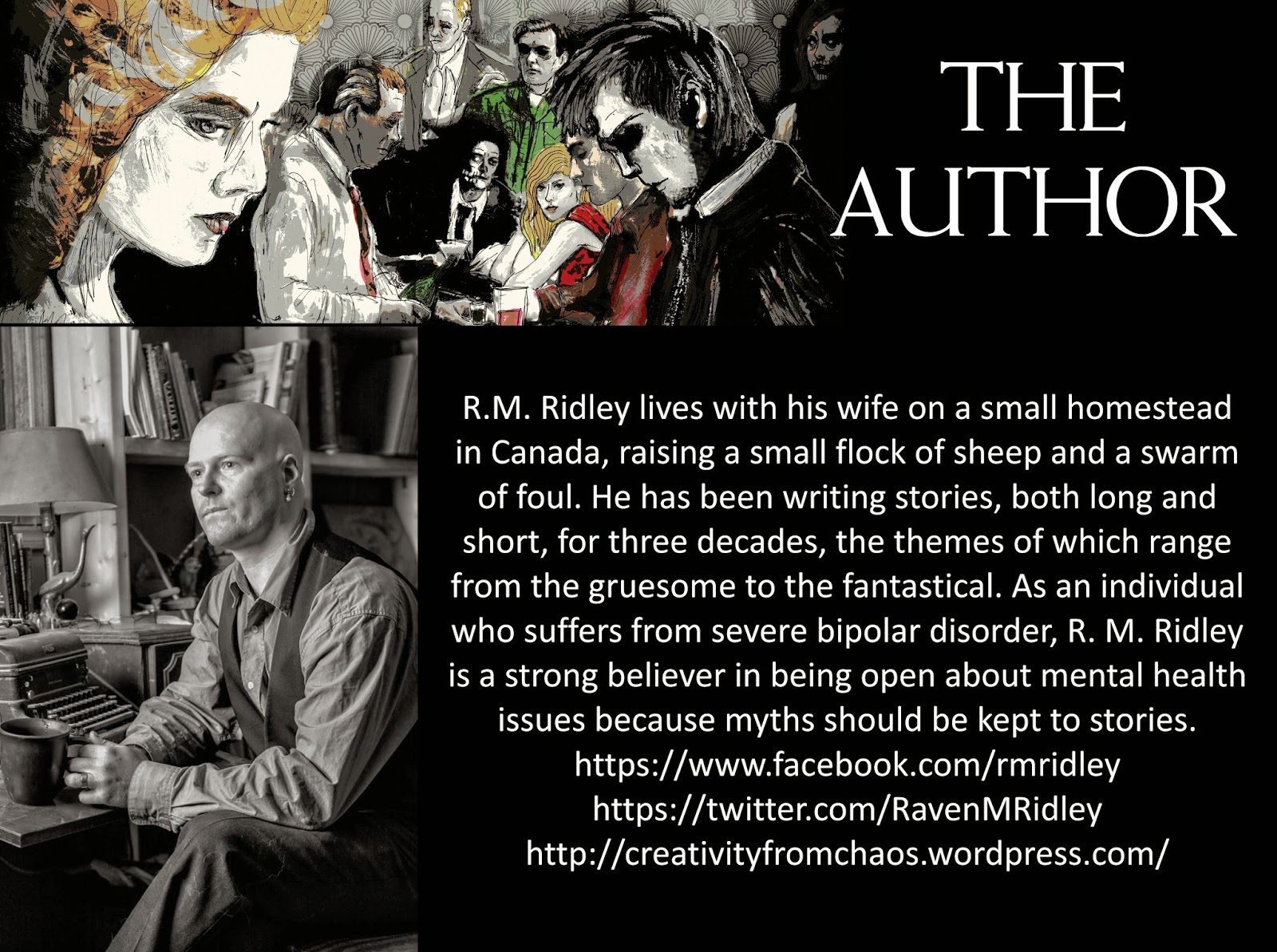 R.M. Ridley lives with his wife on a small homestead in Canada, raising a small flock of sheep and a swarm of foul. He has been writing stories, both long and short, for three decades, the themes of which range from the gruesome to the fantastical. As an individual who suffers from severe bipolar disorder, R. M. Ridley is a strong believer in being open about mental health issues because myths should be kept to stories.