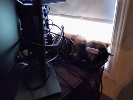 Well, i had to rearrange my office for my work computer. I did this on Saturday, hoping they’d tire of sleeping on the new desk which isn’t actually new. It was just moved, but that’s new enough for my cats.