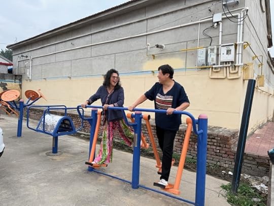 Yesterday, Mei, my elder daughter, (the younger one is travelling in Sichuan, on her way to meet us in Lanzhou) and I arrived from London at dawn and went straight to her village outside Langfang in Hebei. We spent a joyful day and night together—chatting, laughing, sampling the exercise machines in the square, and touring the village perched on her electric tricycle. Xiaohong and I are very different in temperament, yet one thing binds us: we both love to laugh, loud and wholehearted. Yesterday we laughed our teeth off, recalling old stories. She has a mischievous way of twisting foreign words into Chinese: my former sister-in-law Sharon once became xiaren (“shrimp”), while bonjour morphed into ben zhu (“stupid pig”).