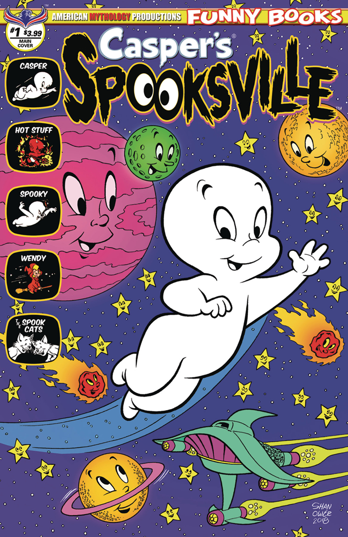 The four issues of the new series Casper's Spooksville contain a continuing story. Casper the Friendly Ghost and his friends--Spooky the Tuff Little Ghost, Wendy the Good Little Witch, and Hot Stuff the Little Devil--journey to another solar system on a planet-hopping adventure.Mike Wolfer wrote it and I drew it. American Mythology published it.