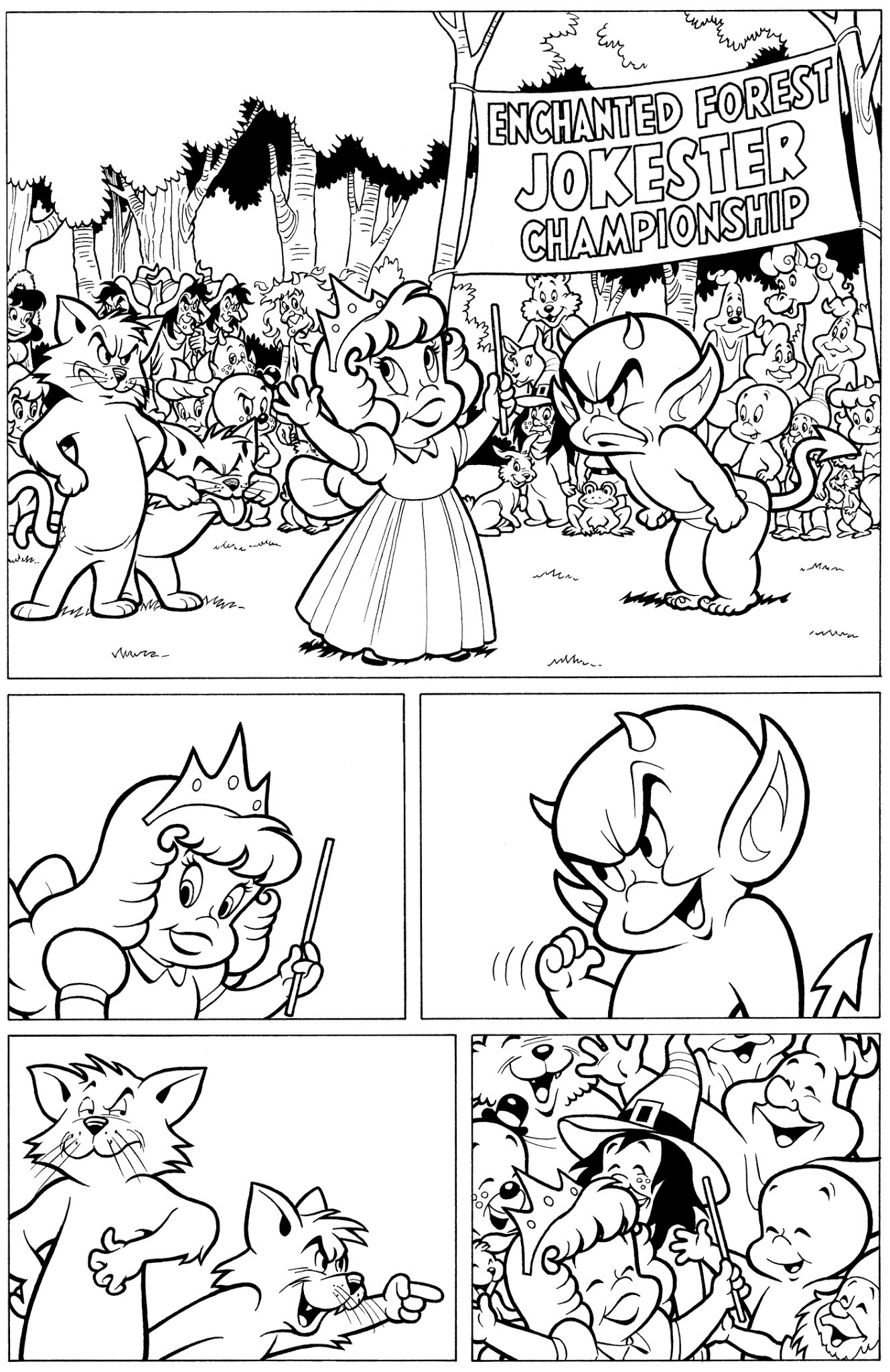 The fourth and final issue features a contest between Hot Stuff and the Spook-cats. Every major character and some minor characters from Casper's supporting cast show up, including Nightmare the Galloping Ghost, the Ghostly Trio, Dumbella, Pearl, the Witch Sisters--even Gnorm Gnome. Just about the only character I didn't manage to fit in was Stumbo the Giant. You can see the original art for page one of this story below.