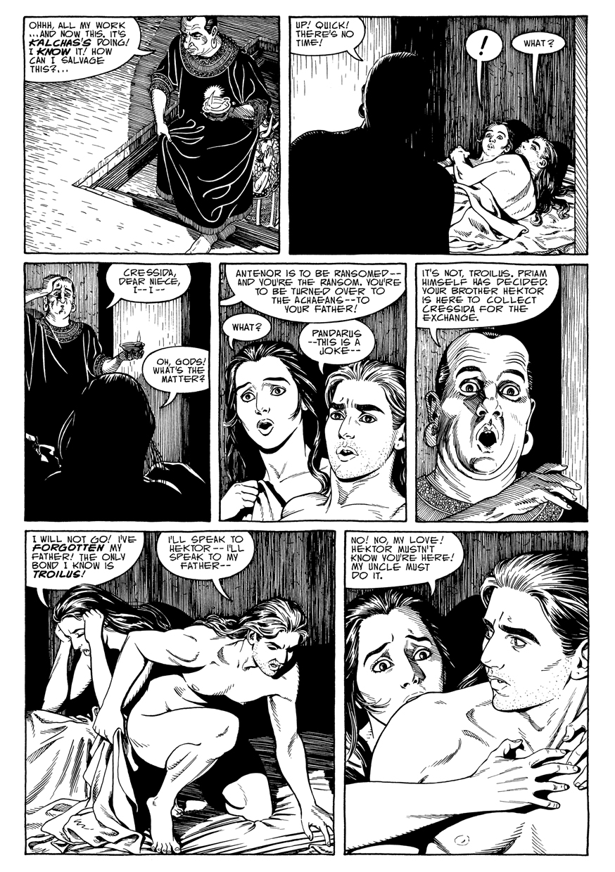 The maximum length for entries was eight pages. I looked over my Age of Bronze scenes featuring Troilus and Cressida's separation and correlated them with scenes from Shakespeare's play. I was surprised to find that I hadn't strayed as far from Shakespeare as I thought I had. I selected some pages, cropped a few panels to fit within the proper length for the competition and sent them in.